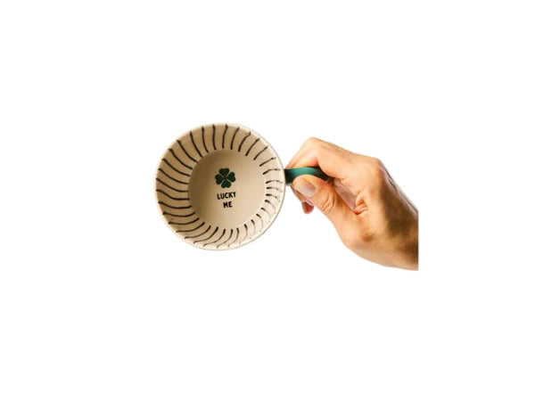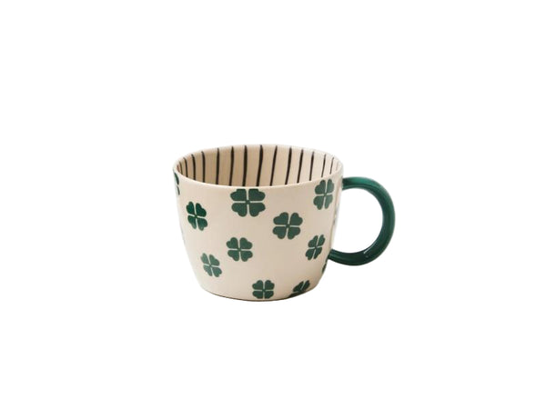 Green four leaf clover's encircle this mug, leading to an interior of thin black stripes and a tiny four-leaf clover and "Lucky Me" inscription on the base, that transforms each sip into a moment of gratitude. Designed in our Sydney studio and hand-finished in Vietnam, its emerald handle adds a flash of colour to your morning coffee ritual or afternoon tea pause.