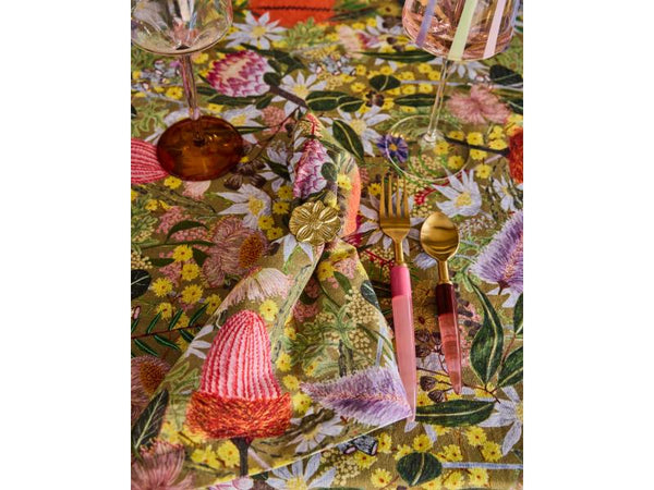 Set the table, set the mood! Our Native Plantation Tablecloth is bold, beautiful and a Kip&Co signature print, made for everyday feasts and special moments alike. With its soft drape and luxe texture, it’s the easiest way to bring a pop of personality to your dining space. Made from a linen cotton blend, this tablecloth features native Australian flora in an all over print on an olive green base. Layer with our range of table linens, cutlery and glassware to finish off the look, and really create a moment to remember.