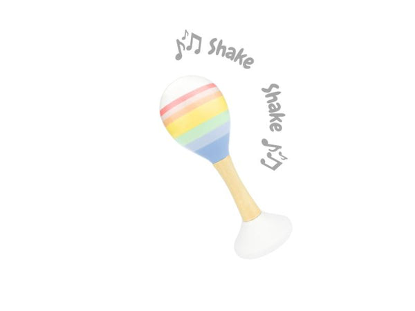 A maraca is often a baby's first toy which will stimulate their senses and develop their awareness as they learn to grasp and shake. This maraca is a must have item for every nappy bag whether you are at home, travelling or out and about. An item that will keep them entertained for a little while. This is well-made and painted in lovely non-toxic paint colours.