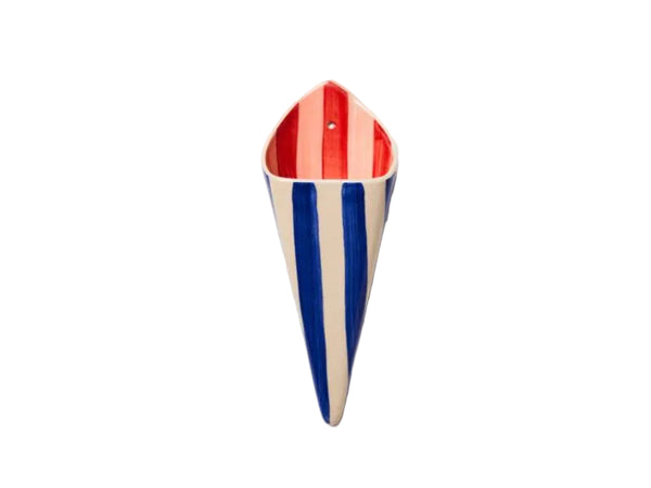 Coastal and crisp, the Folly Blue Stripe Wall Vase features hand-painted navy and cream stripes with a contrasting red and pink interior. Hang it on its own or with others for a pop of pattern and sculptural flair, perfect for a small bouquet, a dried stem, or just a moment of pure style.