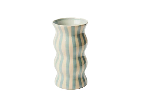 Cool and calming. The Palma Pale Blue Stripe Vase features soft powder blue stripes over a creamy base. Its tall, sculptural shape is both minimal and full of character like a coastal breeze in ceramic form.